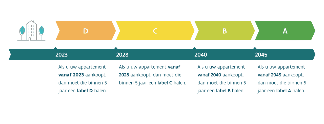 Wie een residentieel goed aankoopt (een huis, appartement, studio,…) met aktedatum vanaf 1 januari 2023 moet binnen 5 jaar deze woning aan een minimaal energieprestatieniveau laten voldoen. Bij aanvang is dat label D, zowel voor ééngezinswoningen (huizen) als voor meergezinswoningen (appartementen, studio’s en kamers).