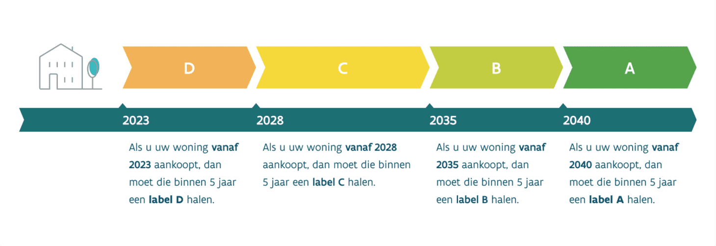- Vanaf 2023 renovatieverplichting tot label D of beter voor woningen met label E of F die worden verkocht.