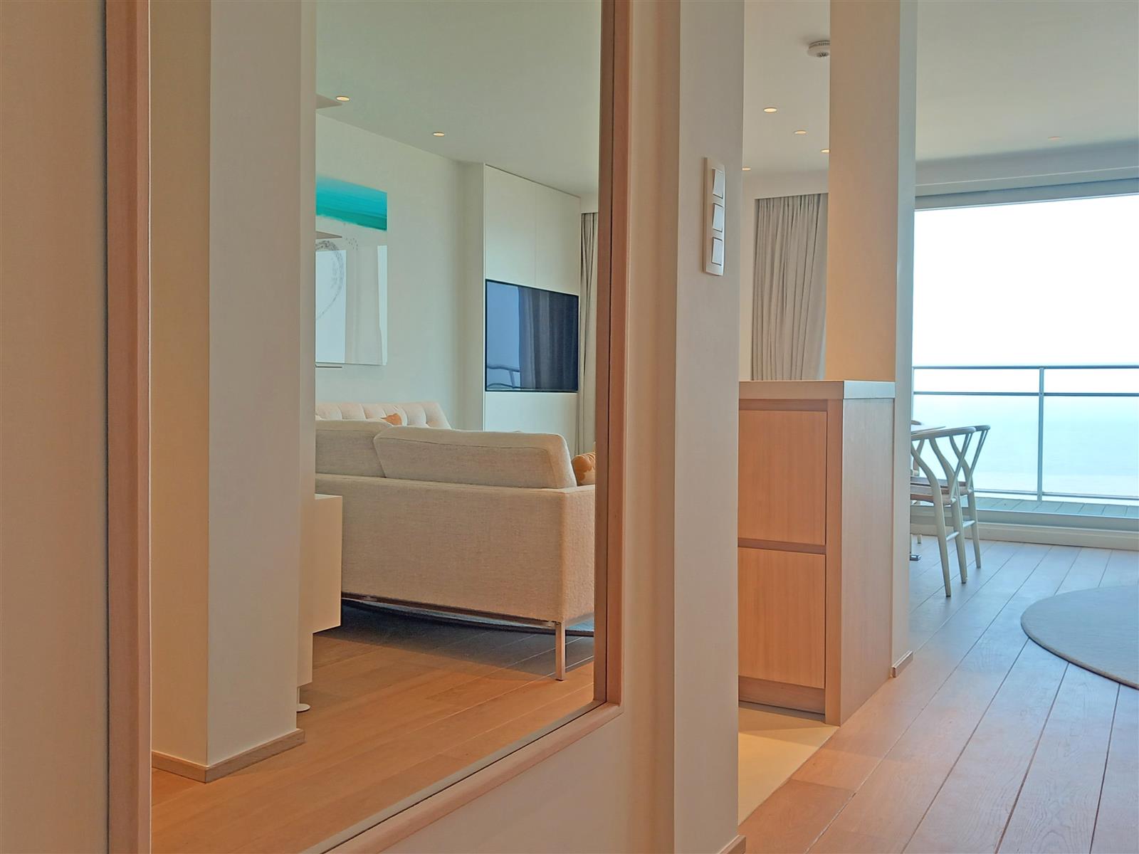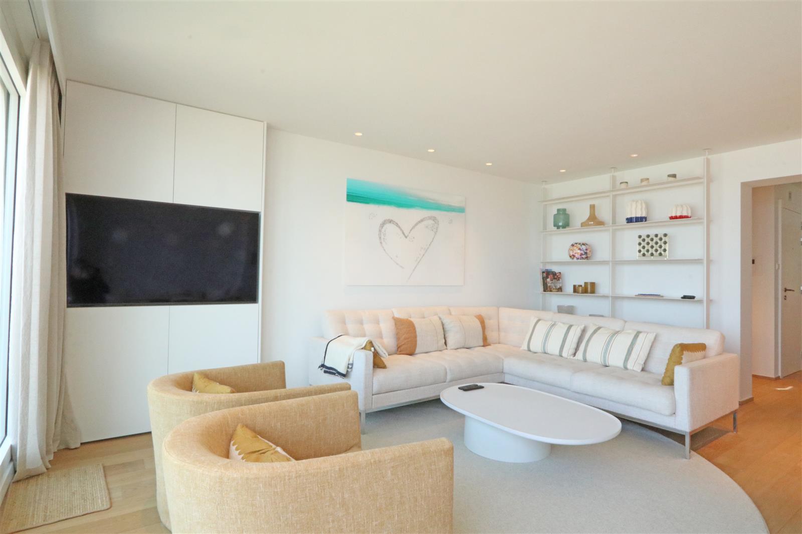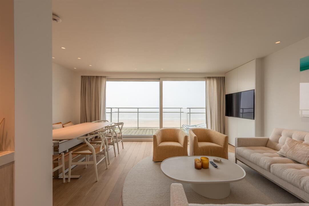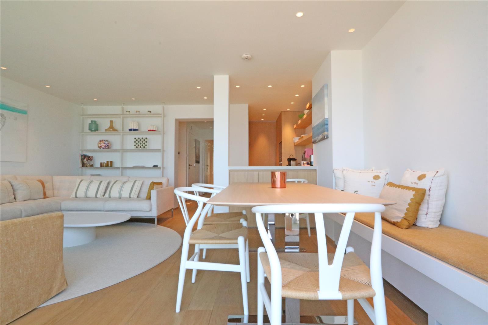 Luxueus afgewerkt appartement met open zicht op zee en een ruim terras aan de voorzijde. Het appartement beschikt een ruime leefruimte met open keuken en toegang tot het terras. Verder zijn er drie slaapkamer, elk met eigen badkamer : De indeling omvat een dubbele slaapkamer met en-suite badkamer voorzien van een ligbad met douchestang, een kinderkamer met twee stapelbedden en een douchekamer, en een derde slaapkamer met twijfelaar en eigen douchekamer. Een private staanplaats is inbegrepen.