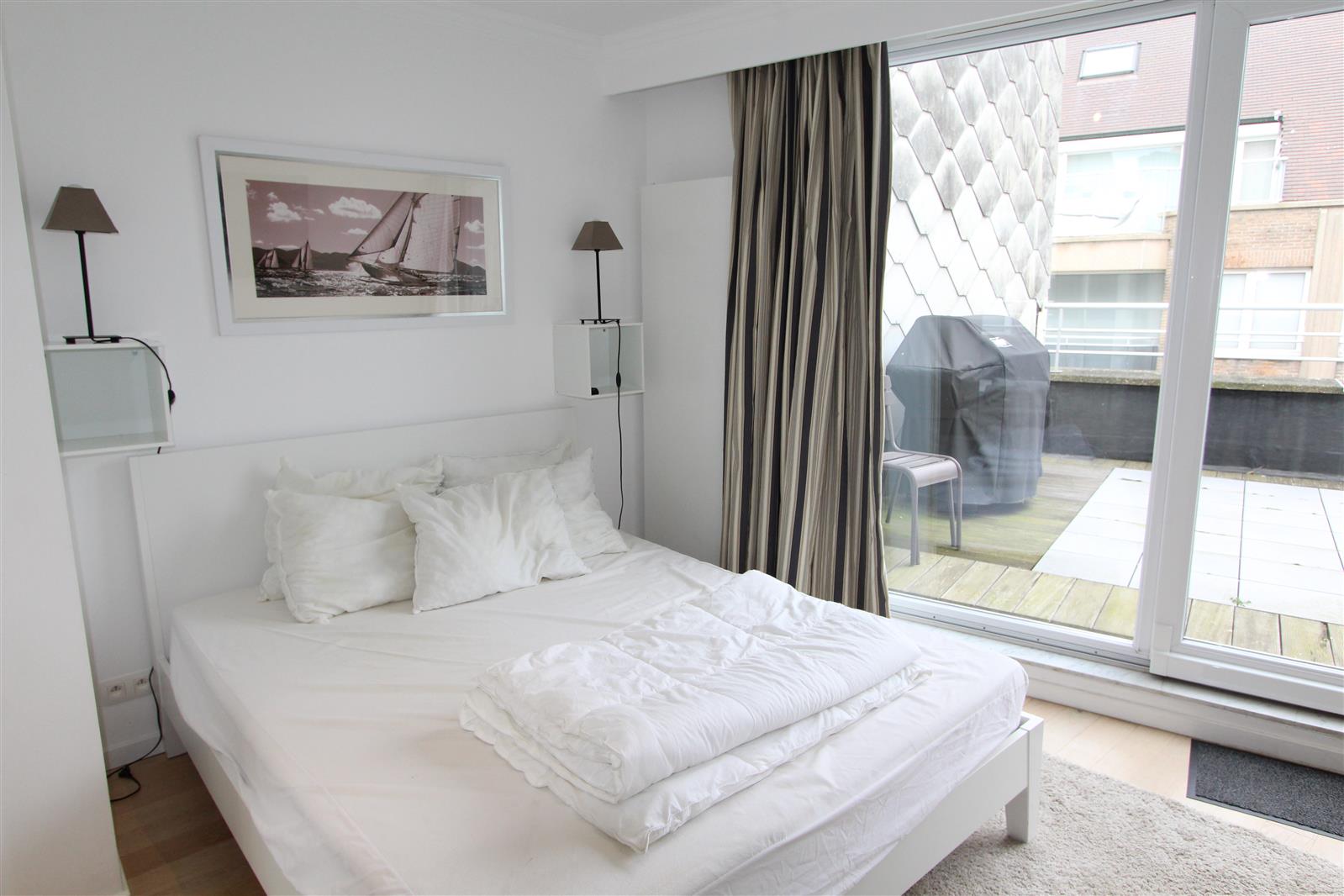 Deze gezellige penthouse bevindt zich in de buurt van het Albertplein en beschikt over een groot terras vooraan waar u kan genieten van een uitgestrekt zijdelings zeezicht. Garagebox inbegrepen.